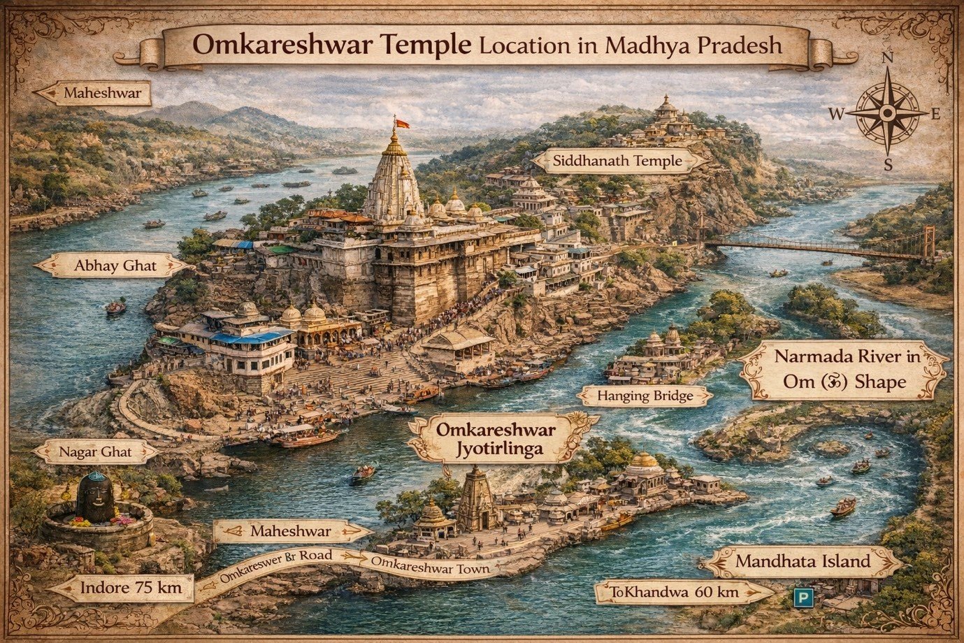 Omkareshwar Temple, located on the sacred Mandhata Island on the Narmada River in Madhya Pradesh, is one of the 12 revered Jyotirlingas of Lord Shiva. Shaped naturally like the holy symbol ‘Om (ॐ)’, Omkareshwar is a powerful pilgrimage destination for Shaiv devotees from across India. The temple is known for its deep spiritual vibrations, ancient legends, and serene river-side setting that creates a truly divine atmosphere.