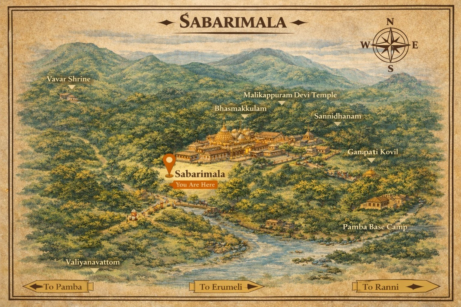 Nestled in the forests of Western Ghats, dedicated to Lord Ayyappa. A journey of strict traditions, 41-day Vratham, and powerful spiritual energy.
