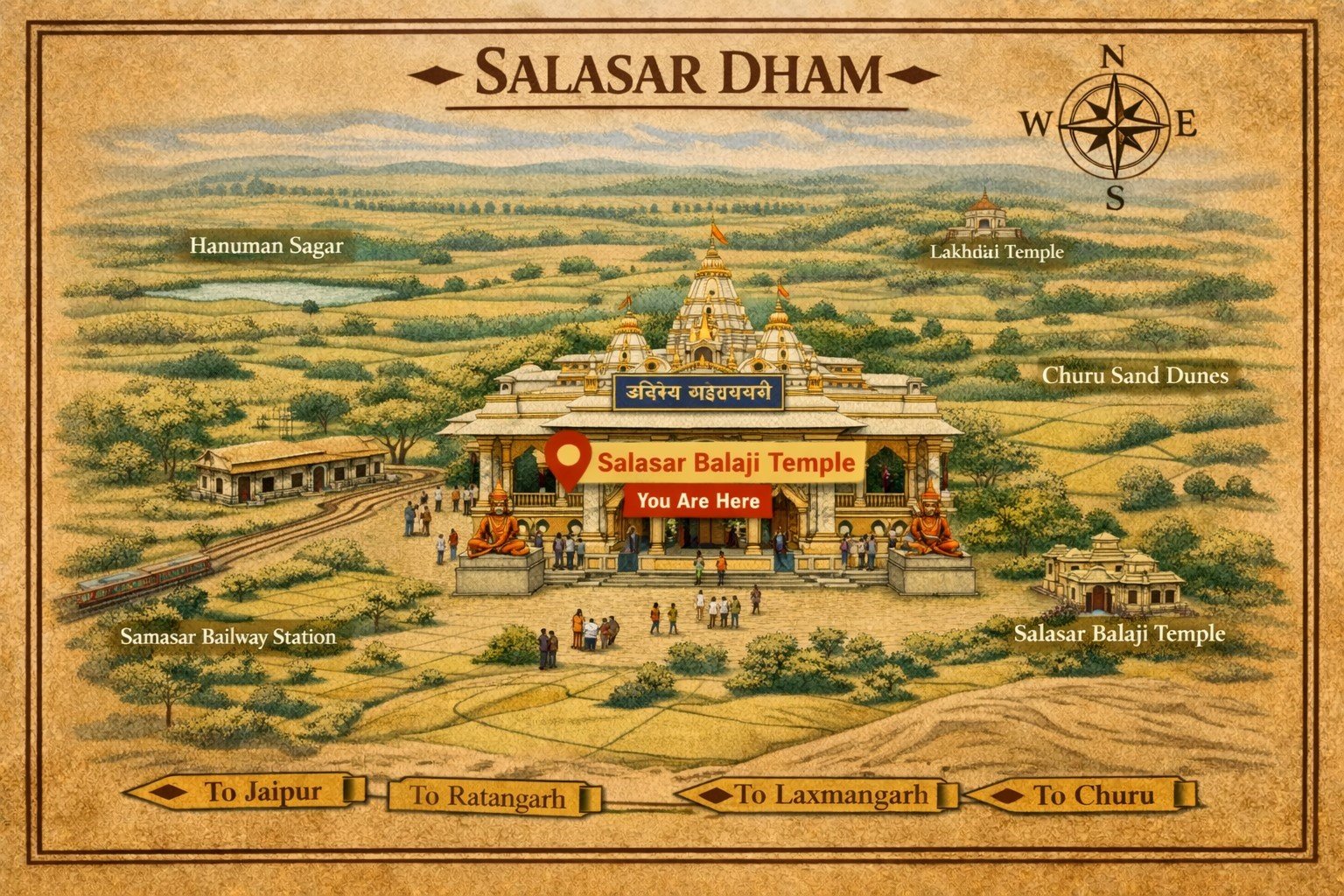 Salasar Dham, located in the Churu district of Rajasthan, is one of the most revered pilgrimage centers dedicated to Lord Hanuman (Salasar Balaji). This sacred temple is believed to fulfill devotees’ wishes and bless them with strength, courage, protection, and prosperity. Millions of devotees visit Salasar Dham every year with unwavering faith and devotion.